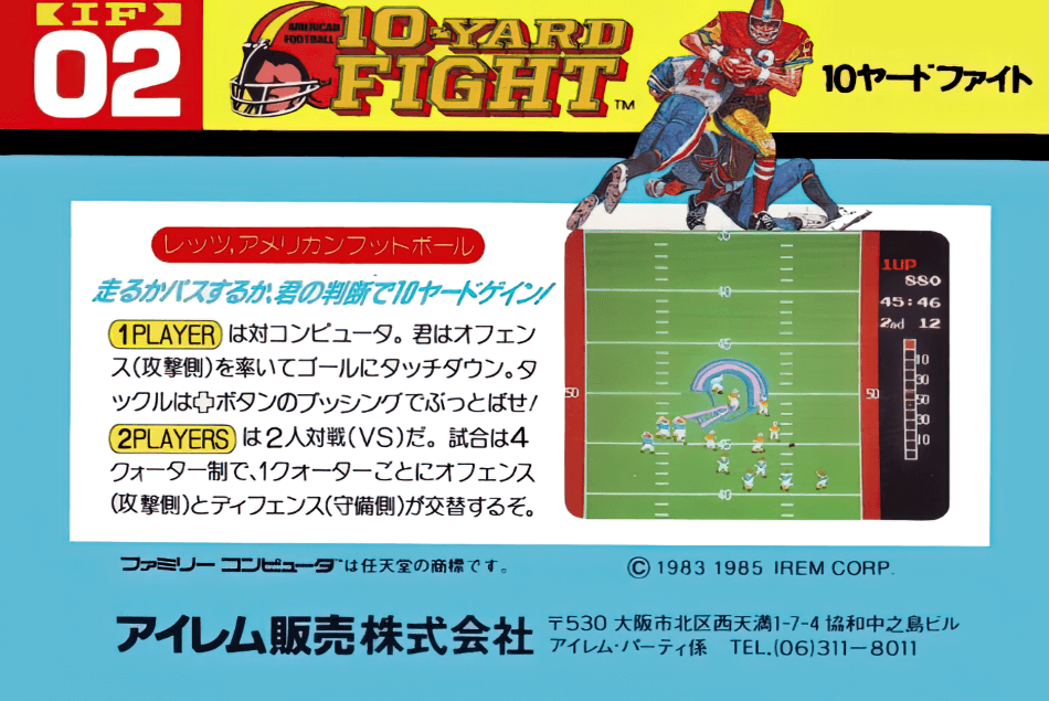 Conclusion : « 10-Yard Fight » est un pilier de la bibliothèque de jeux de la Famicom et un rappel précieux de l’âge d’or des jeux vidéo rétro. Sa simplicité, sa jouabilité accessible et son héritage dans l’histoire des jeux de sport en font un titre qui mérite toujours d’être découvert et apprécié par les joueurs rétro et les amateurs de sport.