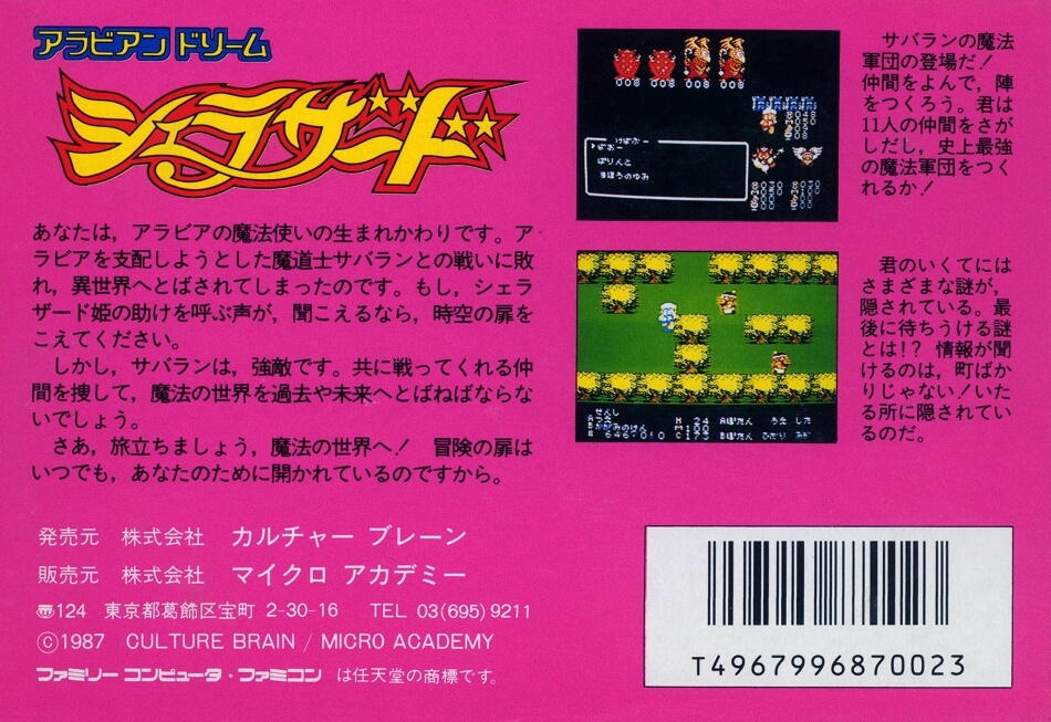 Anecdotes : Bien qu’il ne soit pas aussi célèbre que certains autres jeux Famicom, « Arabian Dream Scheherazade » a acquis une petite base de fans pour son ambiance unique et son histoire captivante.