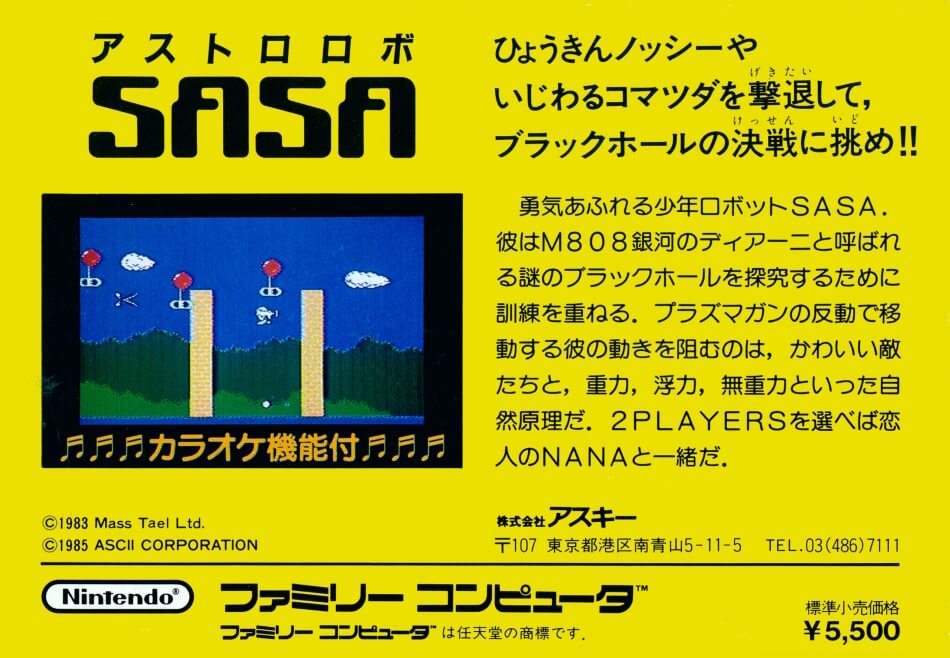 Anecdotes : Bien que « Astro Robo SASA » ne soit pas aussi célèbre que certains autres titres de la Famicom, il est apprécié par les collectionneurs et les amateurs de jeux rétro pour son charme vintage.