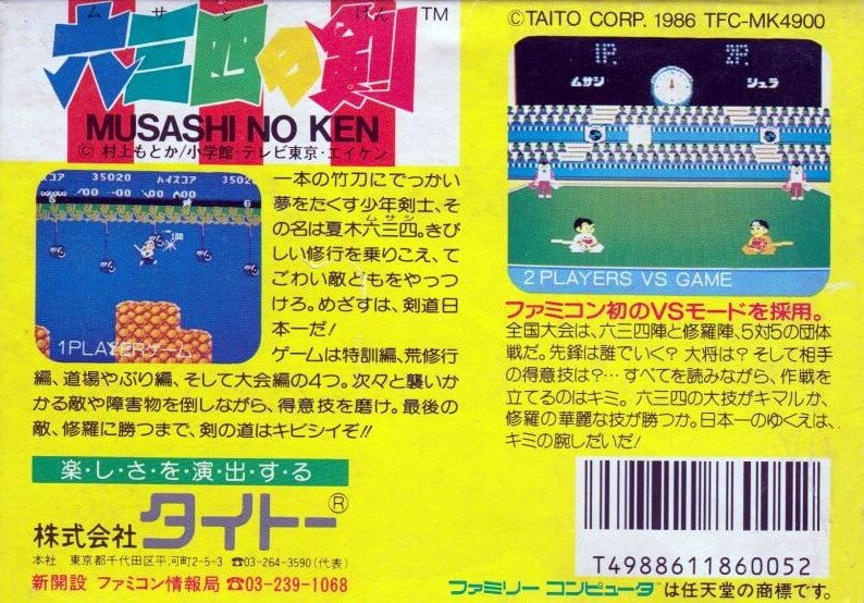 Introduction : « Musashi no Ken: Tadaima Shugyou Chuu » est un jeu d’action sorti sur Famicom en 1987. Le jeu est basé sur le manga du même nom, « Musashi no Ken, » créé par Motoka Murakami.