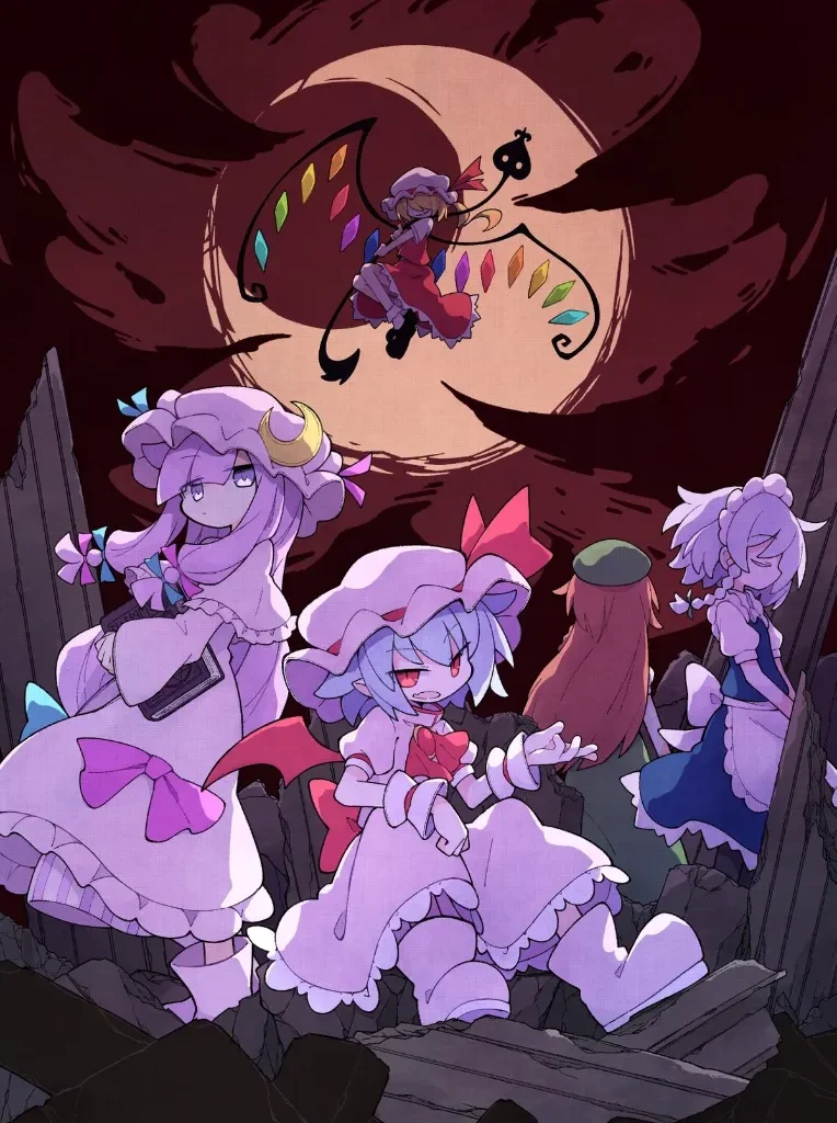 Le sommet du manoir est occupé par les sœurs Scarlet. Remilia, la maîtresse, possède le pouvoir de manipuler le destin, une capacité dont la portée exacte reste ambiguë mais qui lui confère une aura de charisme irrésistible. Malgré ses cinq cents ans, elle conserve des caprices enfantins, organisant des incidents par pur ennui. Sa sœur cadette, Flandre Scarlet, représente la puissance incontrôlée. Confinée dans le sous-sol pendant près de cinq siècles, elle possède la capacité terrifiante de détruire n’importe quoi en écrasant l’« œil » (le point de tension) de l’objet dans sa main. Cette instabilité psychologique et physique en fait l’un des boss additionnels les plus emblématiques de la franchise.